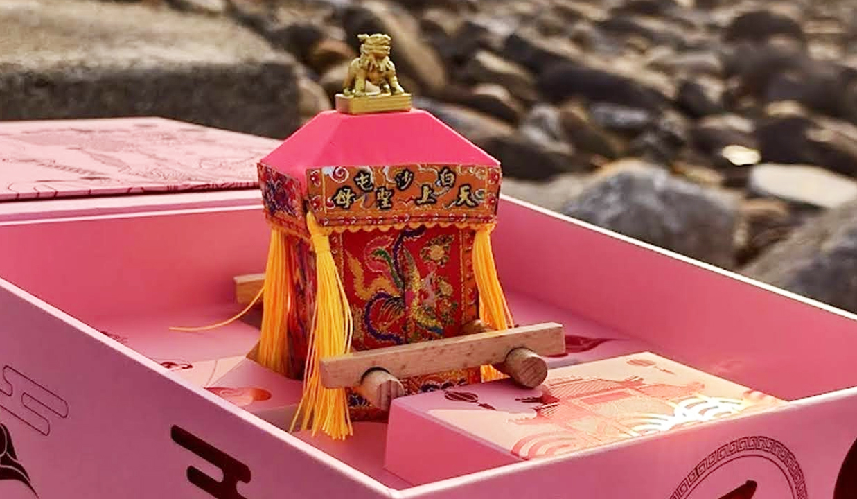 外盒一拿到其實就蠻有感覺的,是粉紅搭配紅色的設計。正面可以看到粉紅超跑的線條圖樣,上面還有雲紋、廟宇圖騰,整體不會太複雜,但很有主題性,一看就知道和白沙屯媽祖有關。